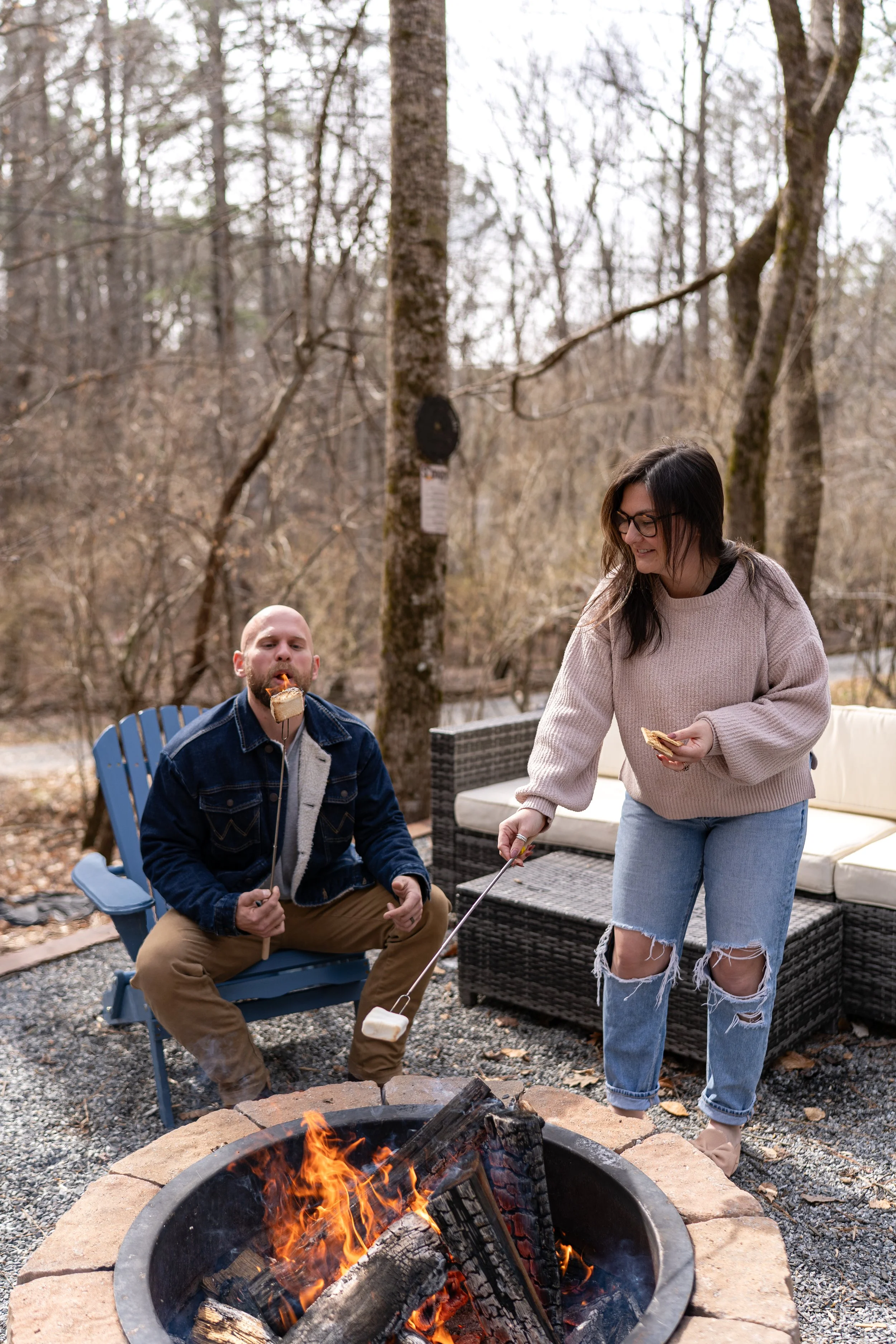 Streams and Dreams is a beautifully updated cabin located in Coosawatee River Resort with a private hot tub, fire pit, outdoor dining, lounging, and serene stream views!